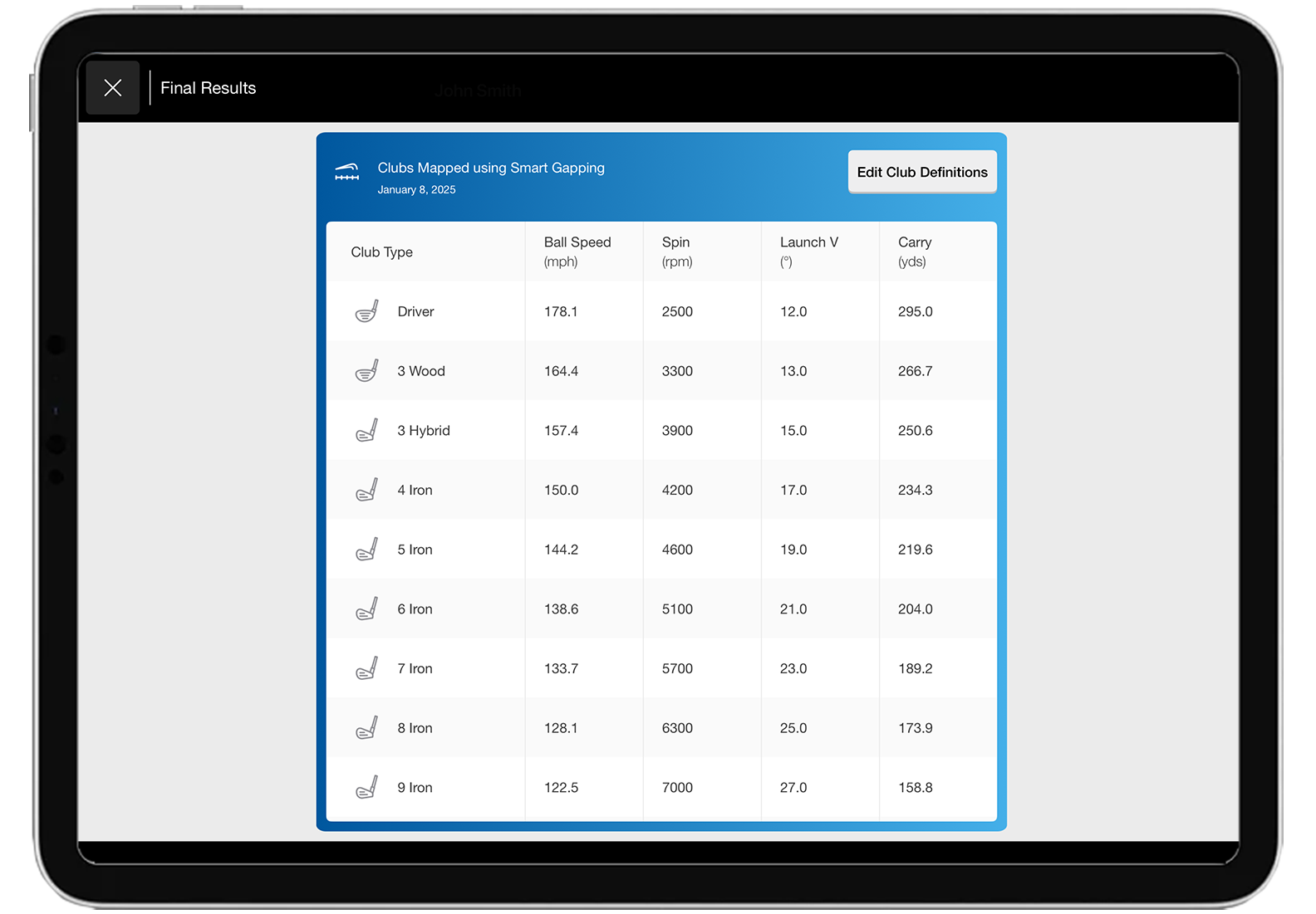 Measures critical data points including carry distance, ball speed, club speed, smash factor, launch angle, and spin rate (calculated). -